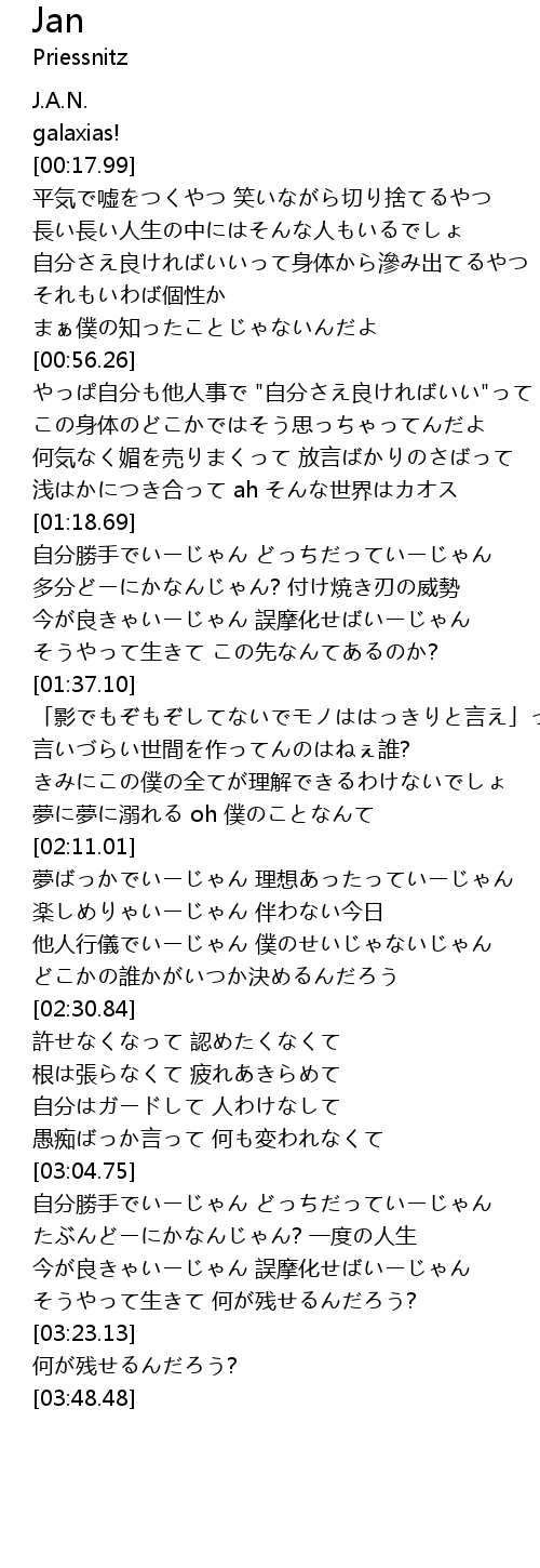 | [03:13.25] | 今が良きゃいーじゃん 誤摩化せばいーじゃん |