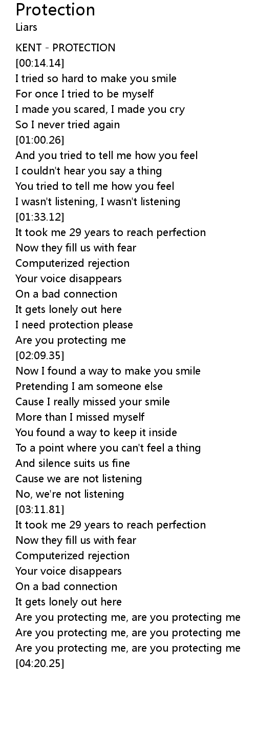 | [03:38.67] | Are you protecting me, are you protecting me |