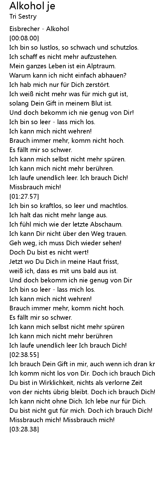 | [03:03.74] | Du bist nicht gut für mich. Doch ich brauch Dich! |