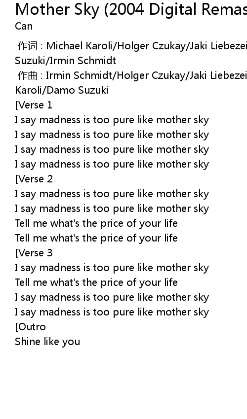 | [00:00.000] | zuò cí : Michael Karoli Holger Czukay Jaki Liebezeit Damo Suzuki Irmin Schmidt |