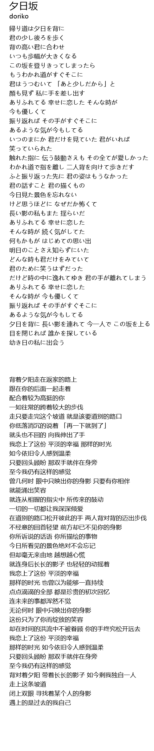 | [05:03.160] | 夕日を背に 長い影を連れて 今一人で この坂を上る |