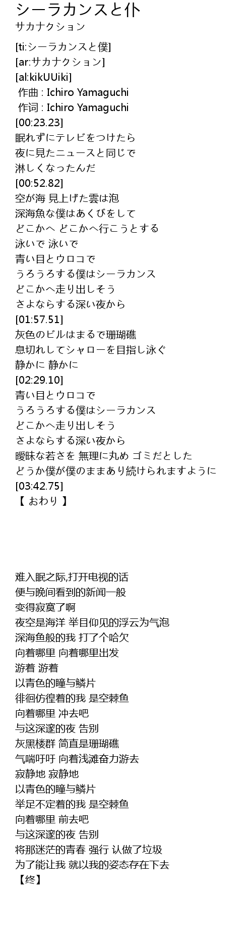 | [03:07.23] | うろうろする僕はシーラカンス |