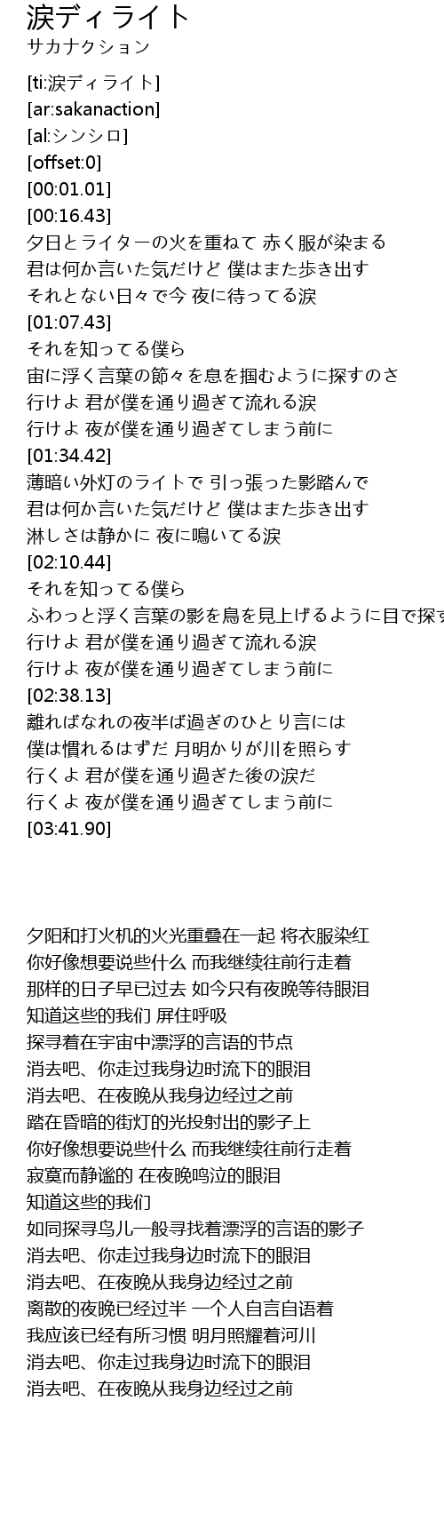 | [01:56.46] | 君は何か言いた気だけど 僕はまた歩き出す |