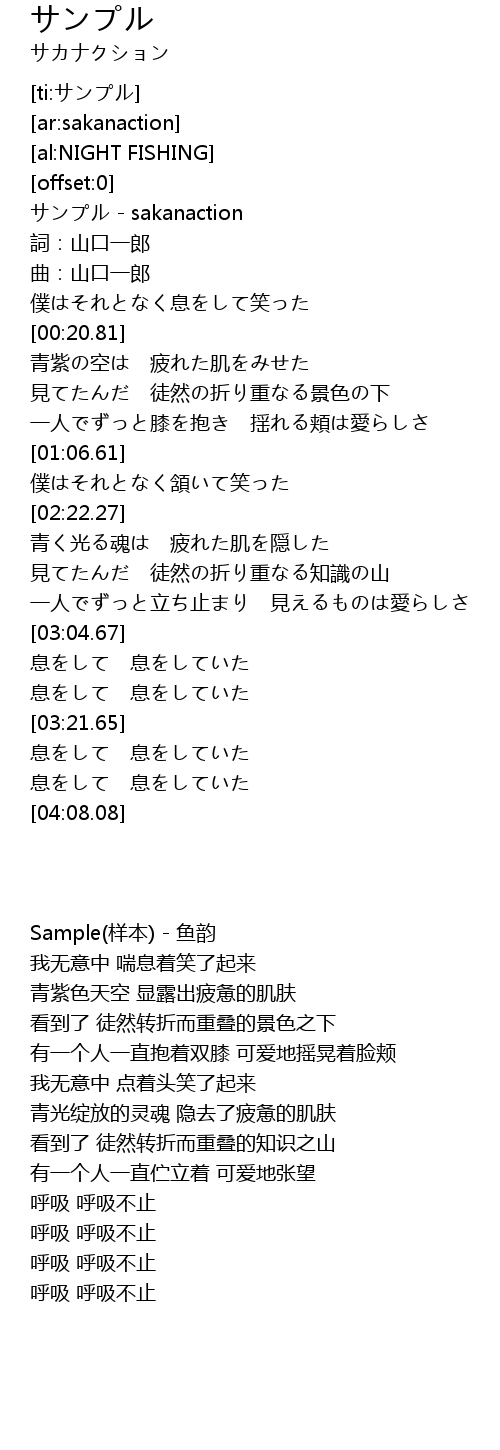 | [00:22.12] | 青紫の空は 疲れた肌をみせた |