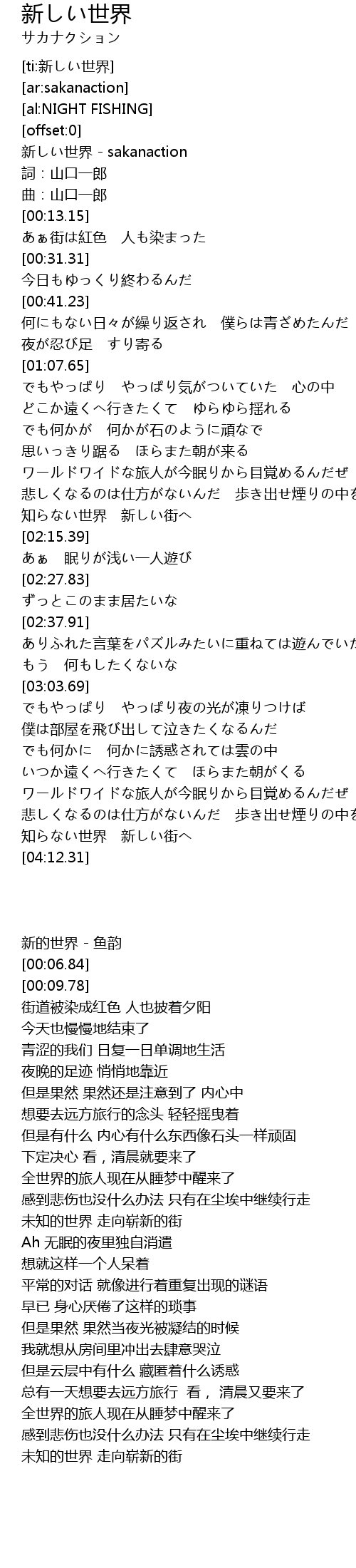 | [00:00.92] | 新しい世界 - sakanaction |
