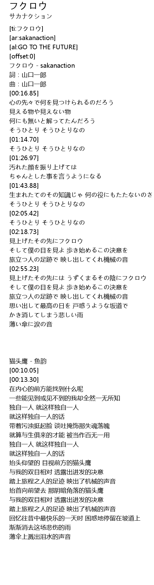 | [03:48.25] | 見上げたその先には うずくまるその陰にフクロウ |