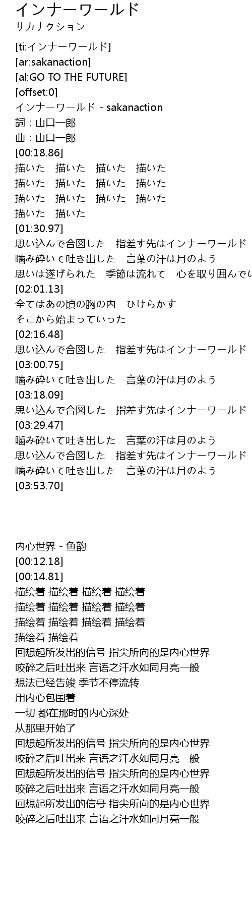 | [03:22.16] | 思い込んで合図した 指差す先はインナーワールド |