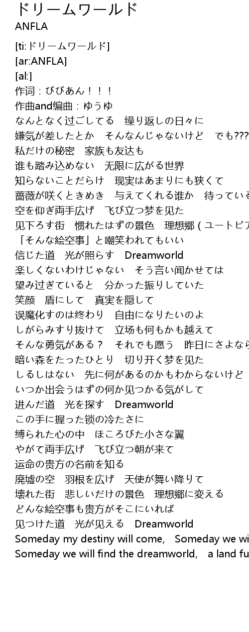 | [03:48.89] | 见つけた道 光が见える Dreamworld |