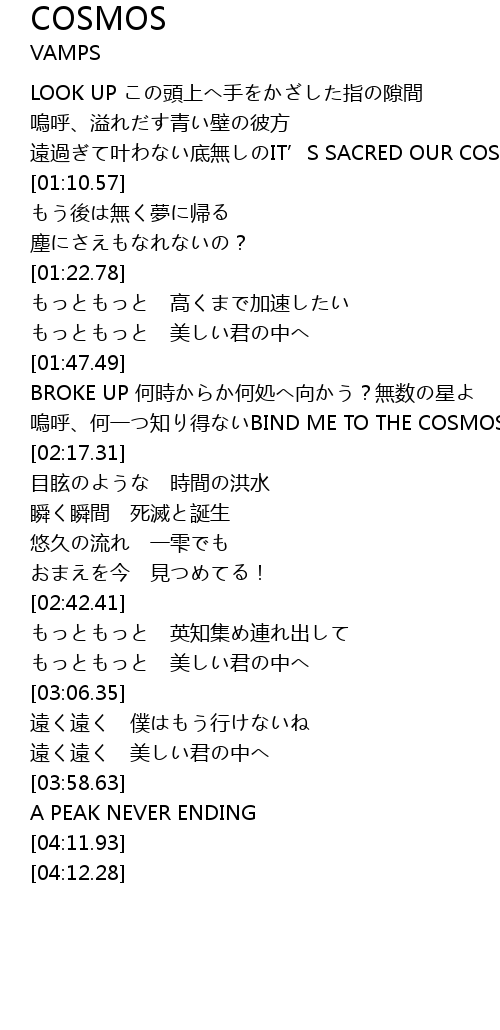 | [00:56.20] | 遠過ぎて叶わない底無しのIT’S SACRED OUR COSMOS |
