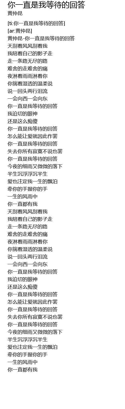 | [00:06.161] | 黄仲昆-你一直是我等待的回答 |