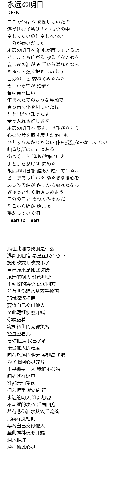| [00:41.54] | yǒng yuǎn míng rì shuí yuàn |