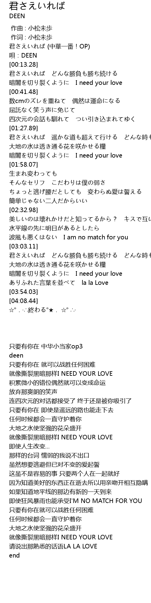 | [03:15.66] | 君さえいれば どんな勝負も勝ち続ける どんな時も守り抜く |