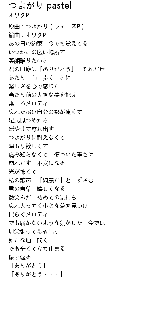 | [00:00.40] | 原曲:つよがり(ラマーズP) |