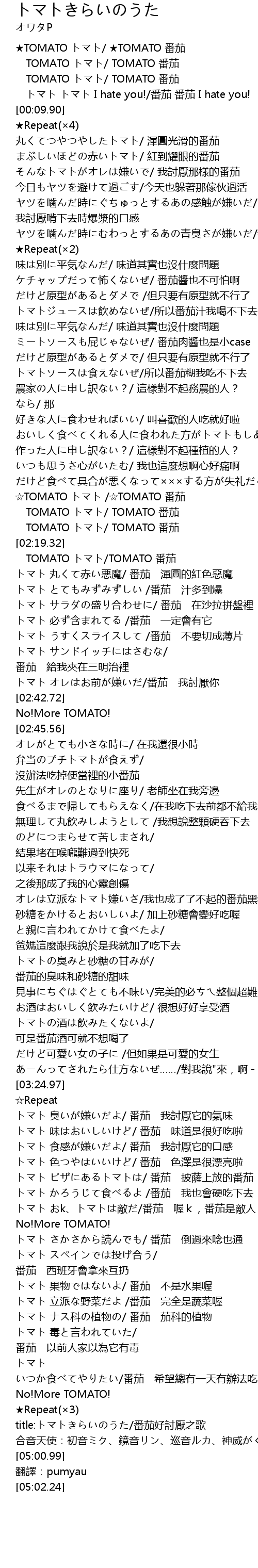 | [00:05.11] | トマト トマト I hate you!/番茄 番茄 I hate you! |