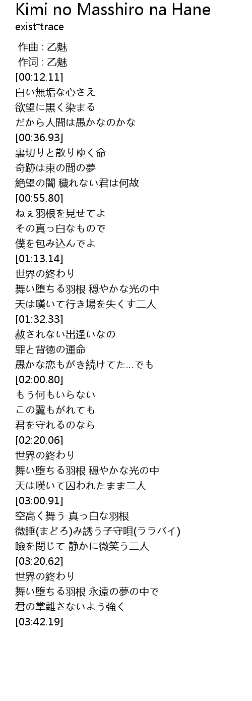 | [01:17.28] | 舞い堕ちる羽根 穏やかな光の中 |