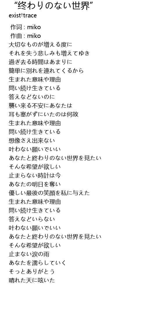 | [03:03.72] | あなたと終わりのない世界を見たい |