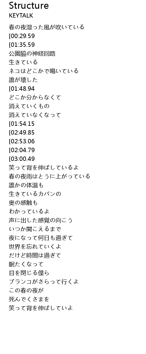 | [00:22.38] | 春の夜湿った風が吹いている |