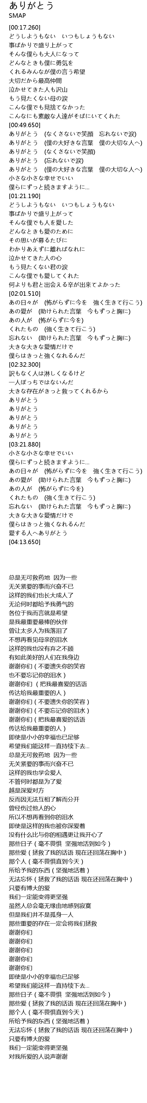 | [00:50.180] | ありがとう (なくさないで笑顔 忘れないで涙) |