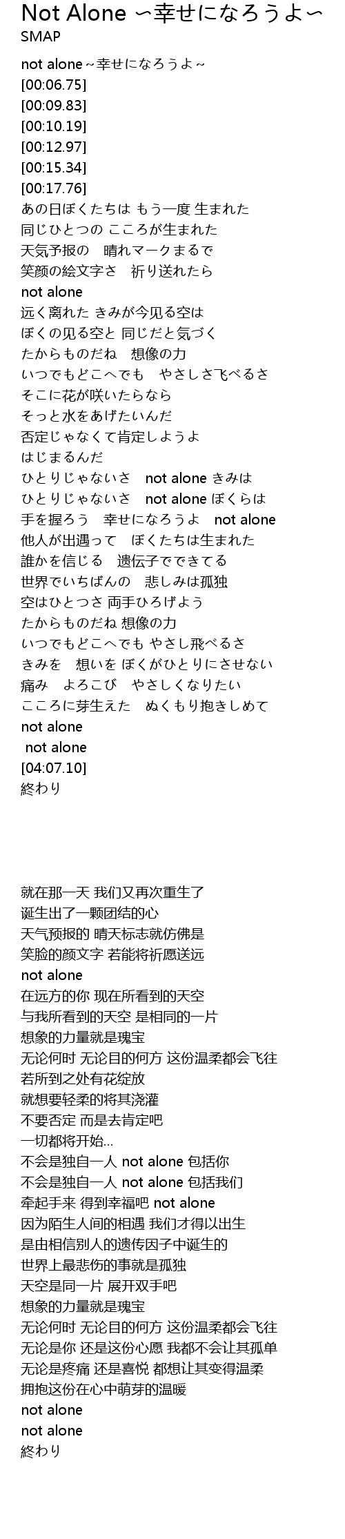 | [00:04.99] | not alone~幸せになろうよ~ |