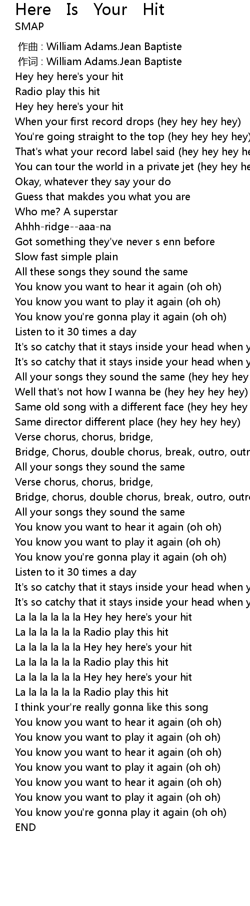 | [01:53.880] | La la la la la la Hey hey here's your hit |