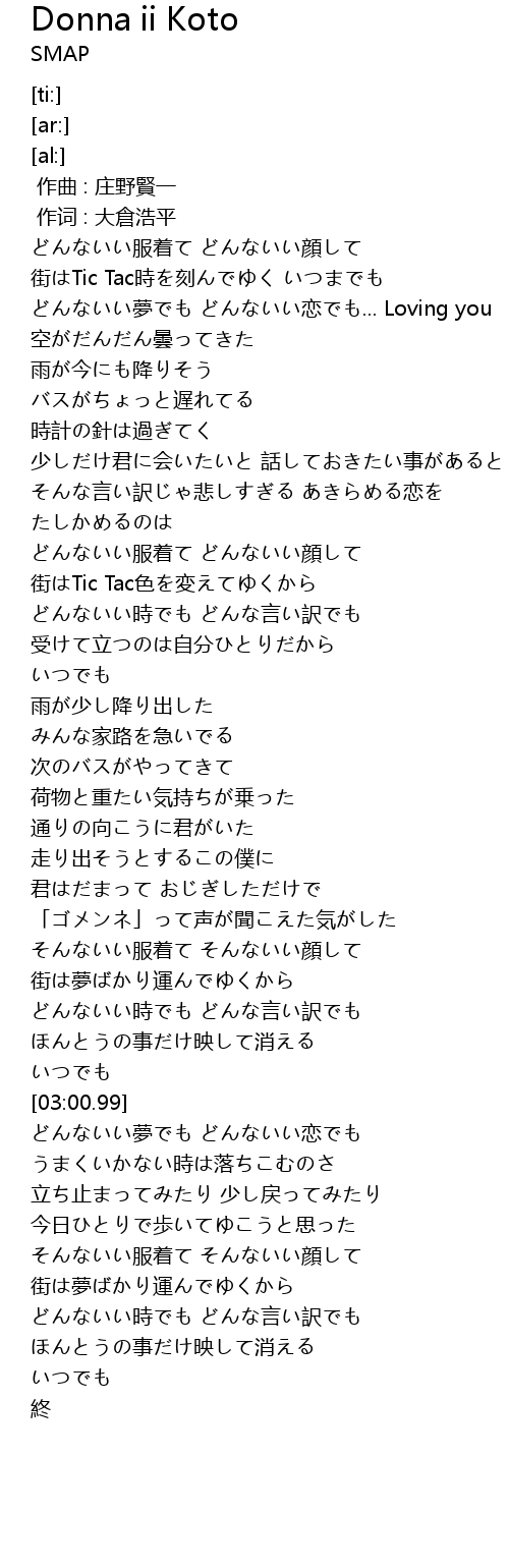 | [03:22.58] | どんないい夢でも どんないい恋でも |