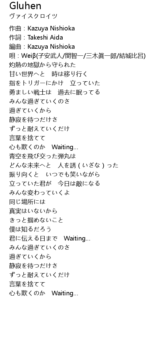 | [0:19.000] | 唄:Weiβ(子安武人/関智一/三木眞一郎/結城比呂) |