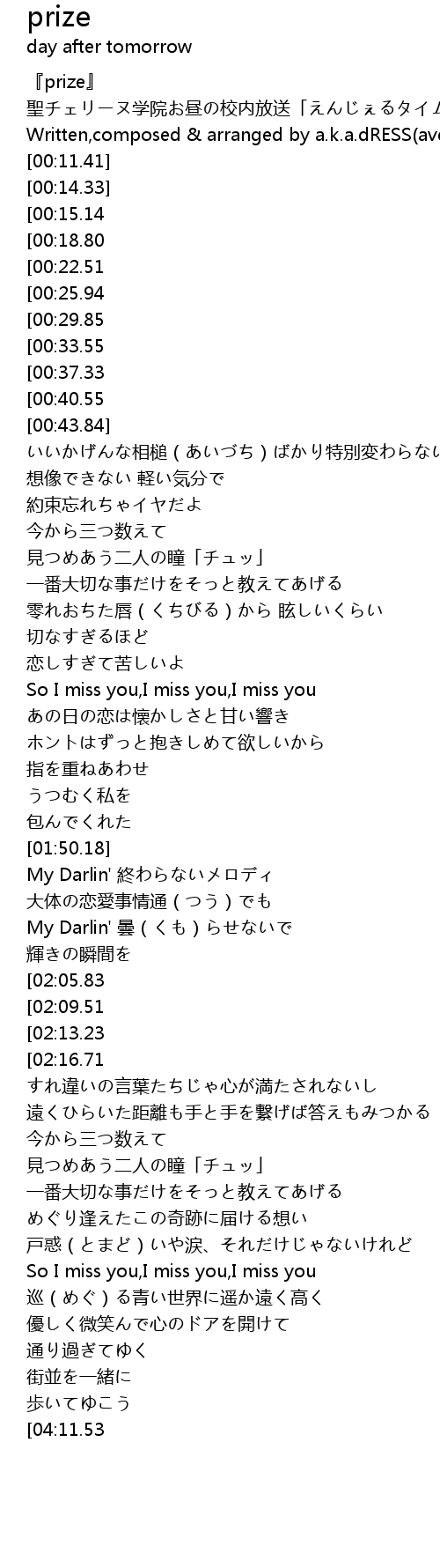 | [03:56.58][02:05.83] | 「prize smile dream」 見つけて欲しい |
