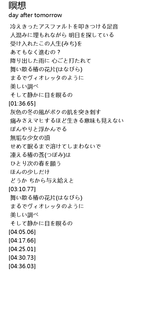 | [03:34.15] | 舞い散る椿の花片(はなびら) |