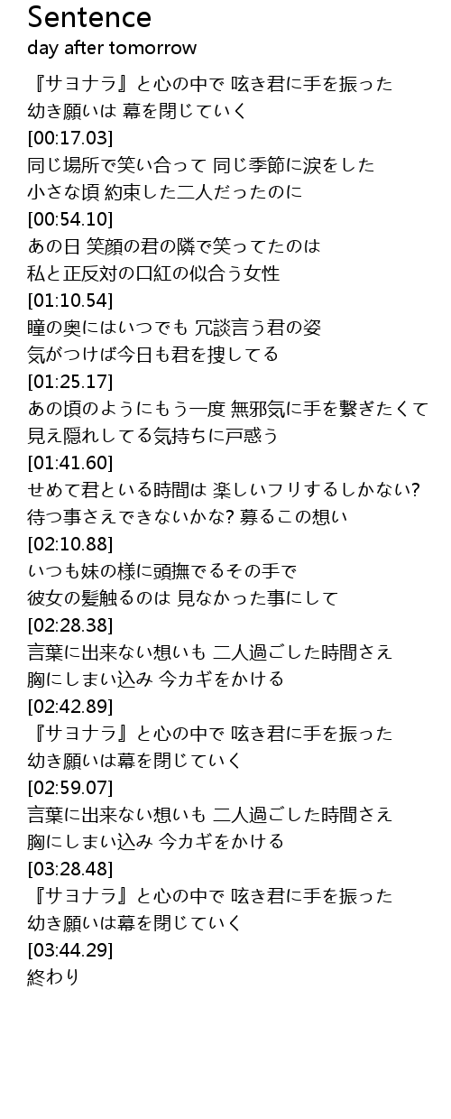 | [03:31.55] | 『サヨナラ』と心の中で 呟き君に手を振った |