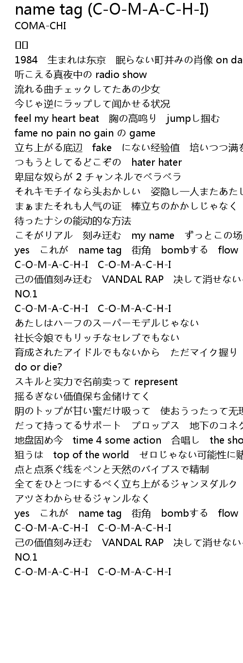 | yes これが name tag 街角 bombする flow 摇らす T.O.K.Y.O. | |