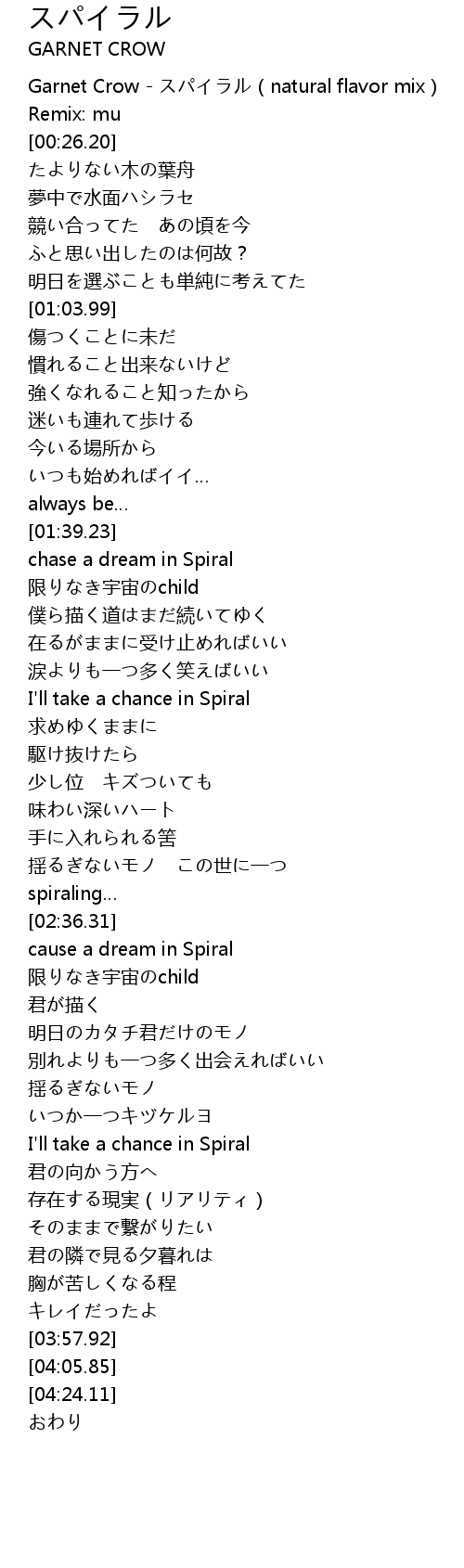 | [00:00.00] | Garnet Crow - スパイラル(natural flavor mix) |