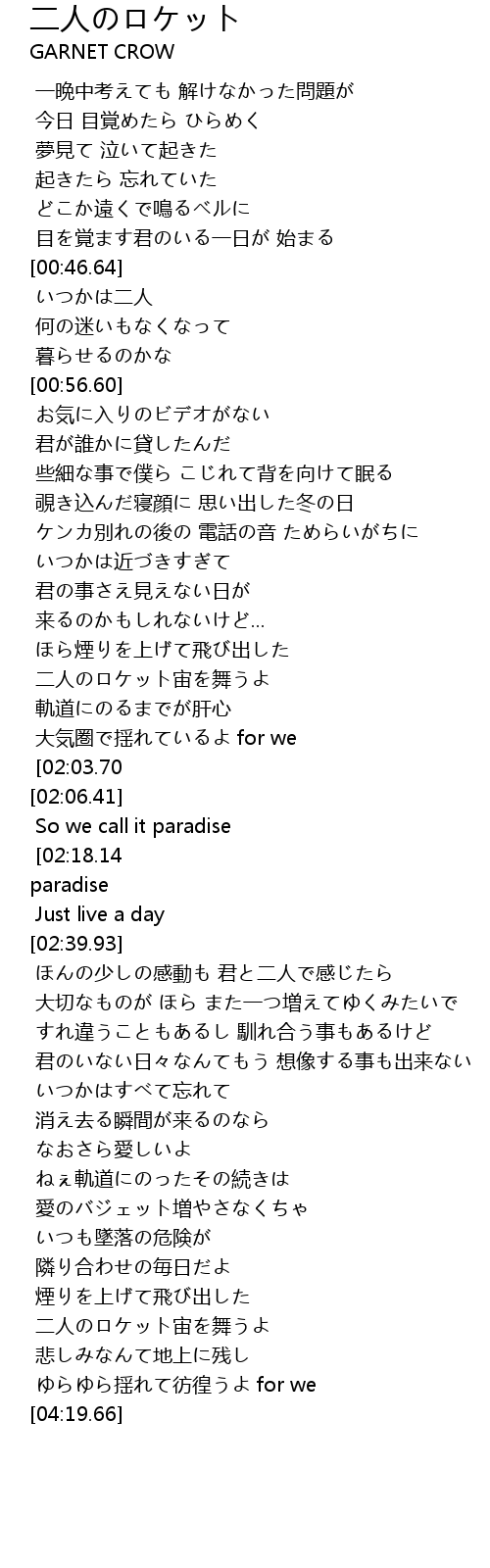 | [03:55.67] | 二人のロケット宙を舞うよ |