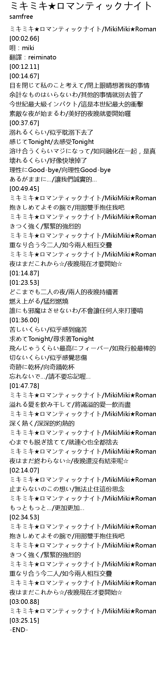 | [02:00.19] | ミキミキ★ロマンティックナイト/MikiMiki★RomanticNight |
