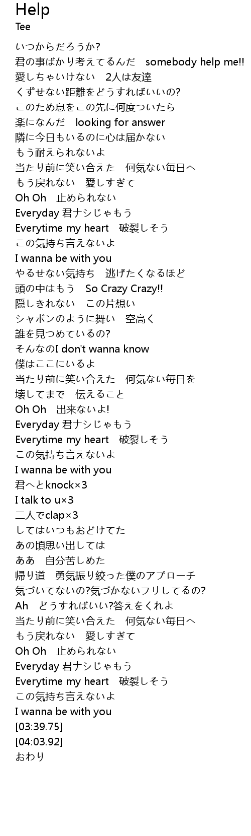 | [00:20.36] | 君の事ばかり考えてるんだ somebody help me!! |