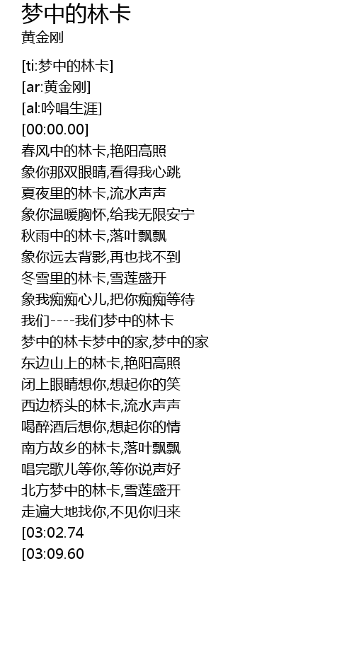 | [03:27.53][03:09.60] | 梦中的林卡梦中的家,梦中的家 |