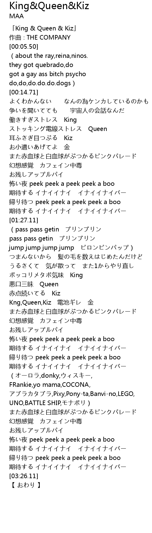 | [00:01.50] | 「King & Queen & Kiz」 |