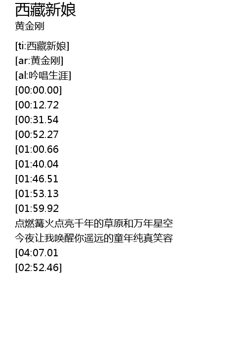 | [02:09.33][04:07.01] | 西藏新娘 我想你…… |
