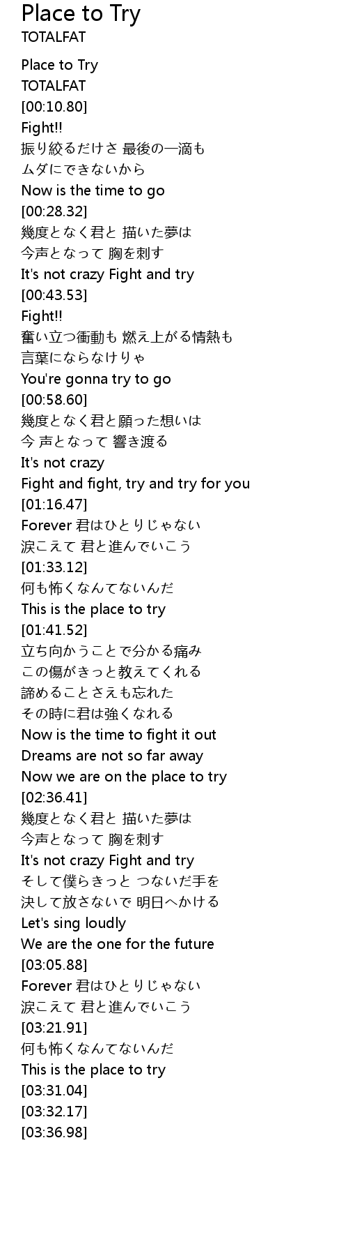 | [00:15.77] | 振り絞るだけさ 最後の一滴も |