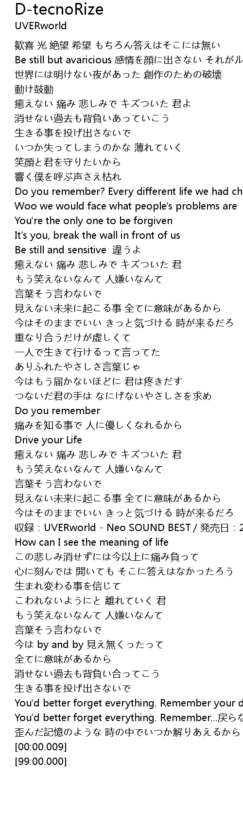 | [03:13.74] | 収録:UVERworld - Neo SOUND BEST/発売日:2009/12/09 |