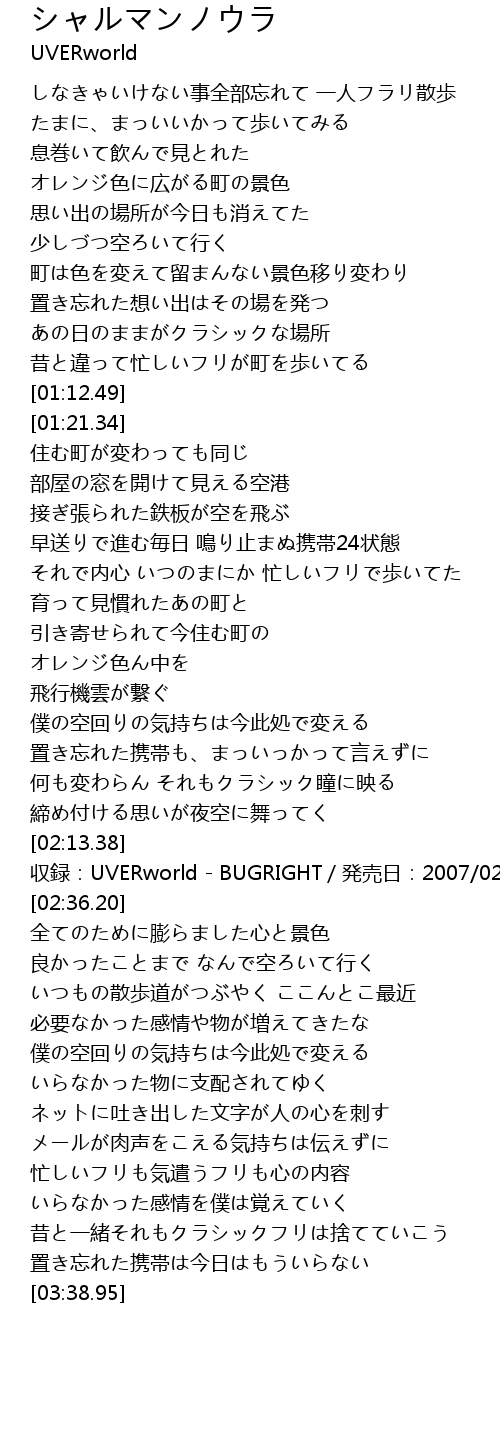 | [02:16.38] | 収録:UVERworld - BUGRIGHT/発売日:2007/02/21 |
