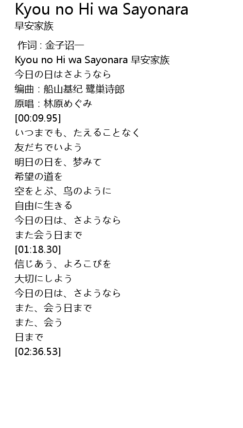 | [00:00.78] | Kyou no Hi wa Sayonara 早安家族 |