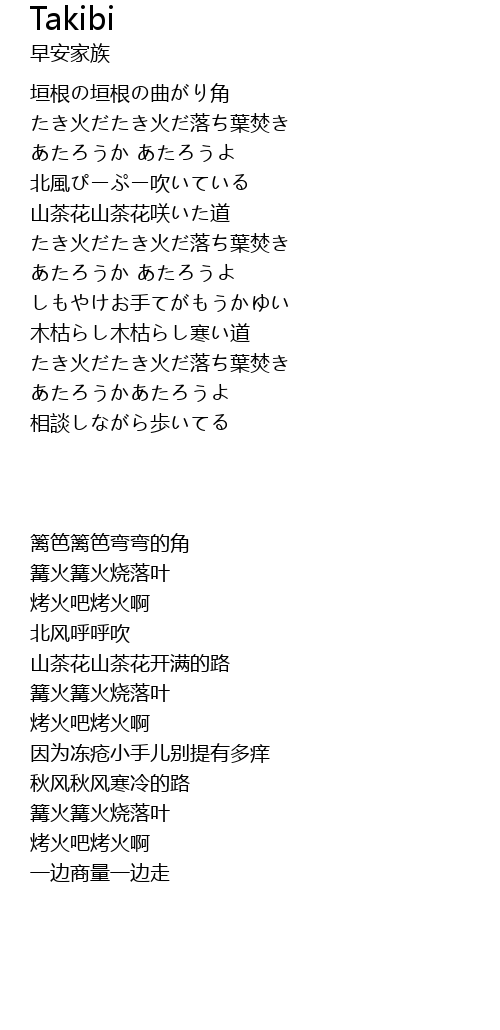 | [00:14.69] | たき火だたき火だ落ち葉焚き |
