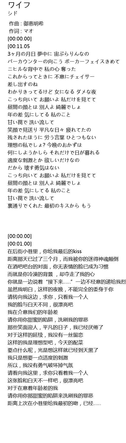 | [00:01.00][00:11.05] | 裏通りでくれた 最後のキスから もう |