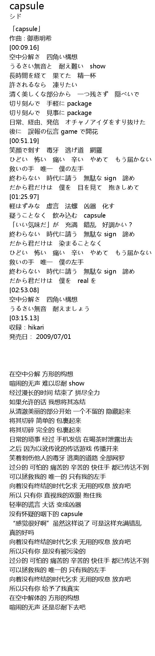 | [02:07.03] | 疑うことなく 飲み込む capsule |