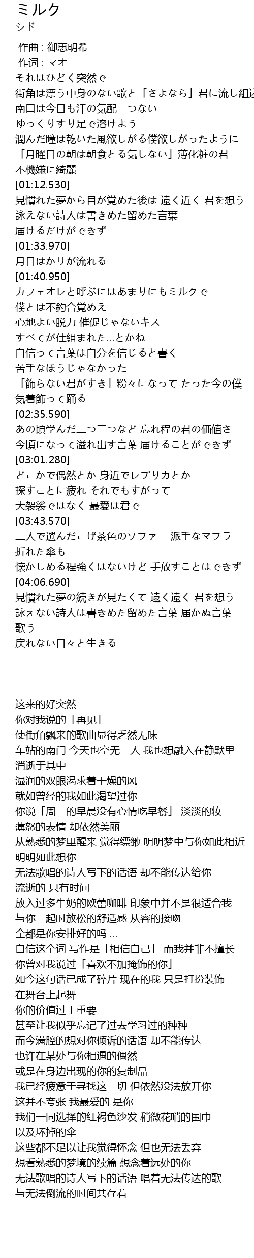 | [01:51.770] | カフェオレと呼ぶにはあまりにもミルクで 僕とは不釣合覚めえ |