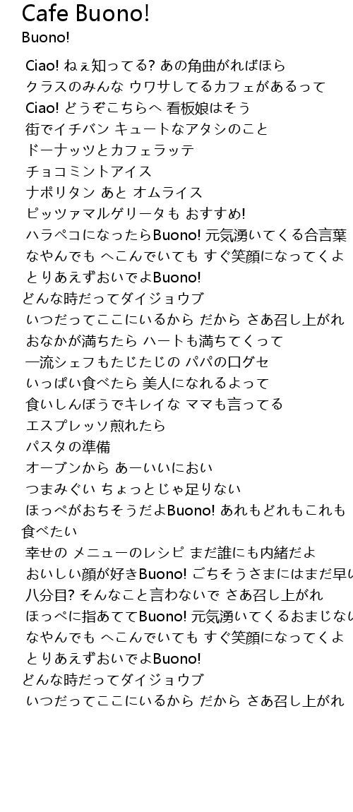 | [01:39.466] | とりあえずおいでよBuono! どんな時だってダイジョウブ |