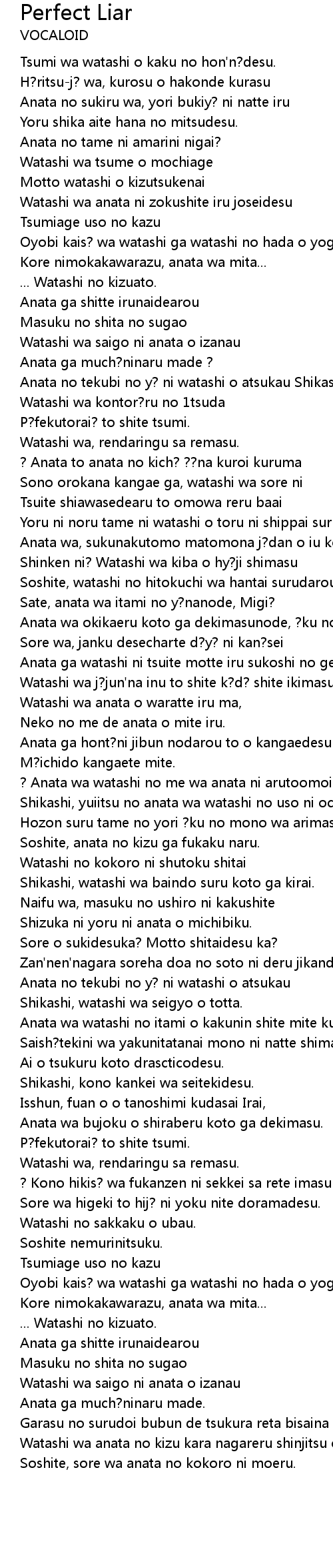 | Shikashi, yuiitsu no anata wa watashi no uso ni ochita. | |