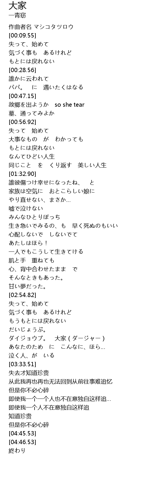 | [03:15.96] | ダイジョウブ。 大家(ダージャー) |
