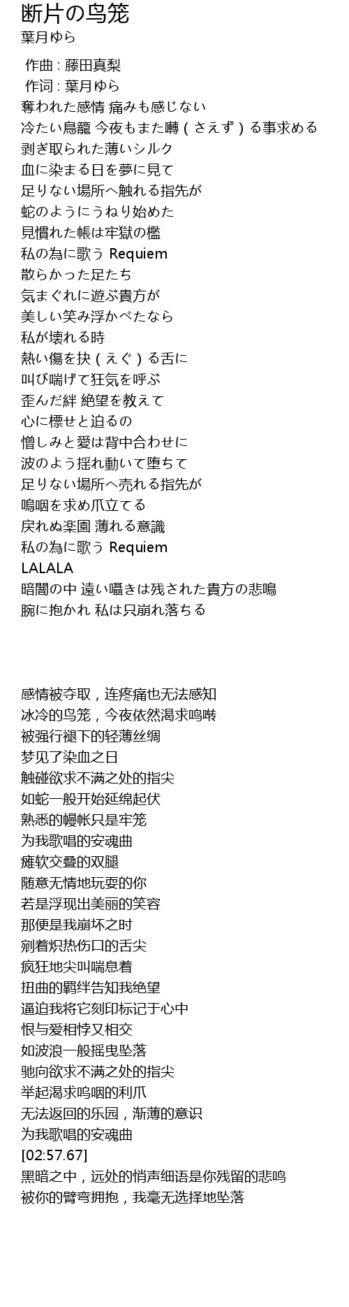 | [00:42.31] | 冷たい鳥籠 今夜もまた囀(さえず)る事求める |