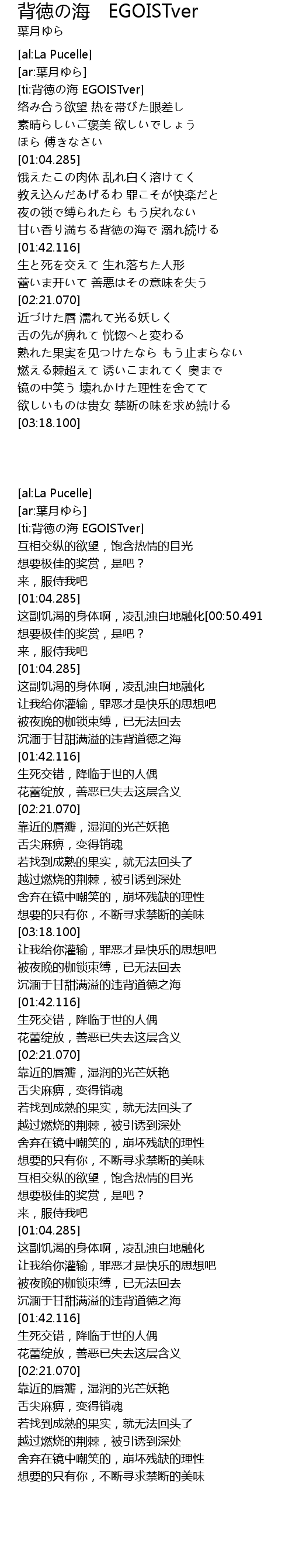 | [01:33.182] | 甘い香り満ちる背徳の海で 溺れ続ける |